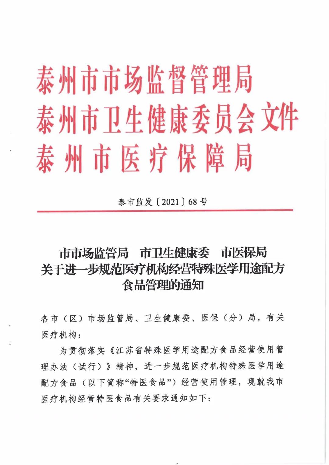 為貫徹落實《江蘇省特殊醫(yī)學用途配方食品經(jīng)營使用管理辦法(試行)》精神,進一步規(guī)范醫(yī)療機構(gòu)特殊醫(yī)學用途配方食品(以下簡稱“特醫(yī)食品”)經(jīng)營使用管理。 江蘇省泰州市市場監(jiān)管管理局、泰州市衛(wèi)生健康委員會、泰州市醫(yī)療保障局聯(lián)合發(fā)布《關(guān)于進一步規(guī)范醫(yī)療機構(gòu)經(jīng)營特殊醫(yī)學用途配方食品管理的通知》。