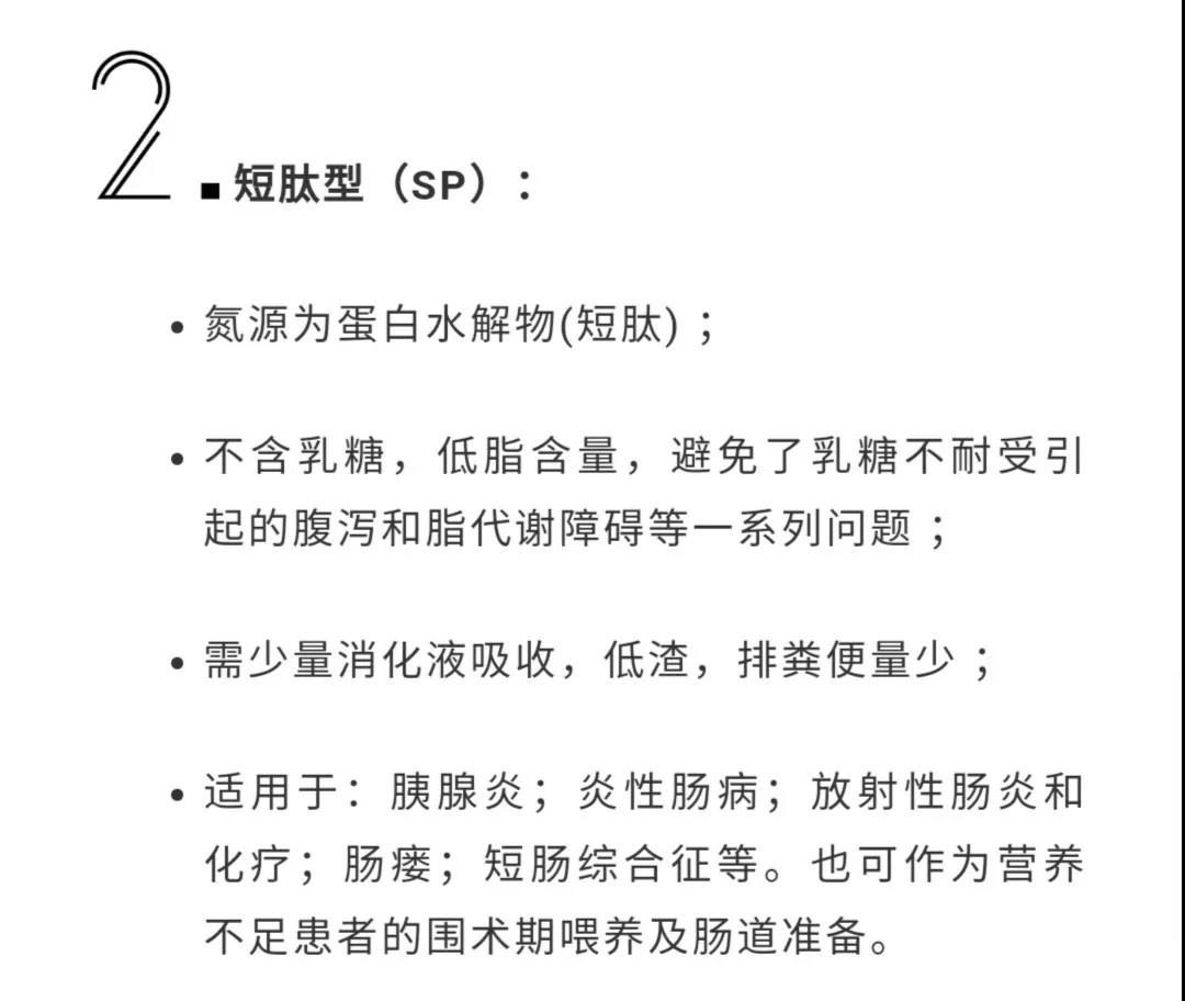 ② 胃腸道功能:胃腸道功能正常者應(yīng)選用整蛋白制劑,對于胃腸道功能低下者,如急性胰腺炎、克羅恩病、短腸綜合征患者等宜選用短肽型腸內(nèi)營養(yǎng)制劑。