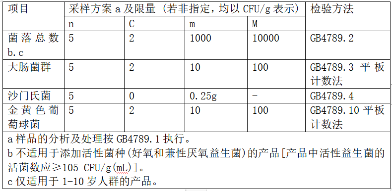 特殊醫(yī)學(xué)用途配方食品的微生物指標(biāo)是根據(jù)GB4789制定的,主要檢測項(xiàng)目是菌落總數(shù)(不適用添加活性菌種的產(chǎn)品)、大腸菌群、金黃色葡萄球菌、沙門氏菌,限量見表4(制表:馬超)。