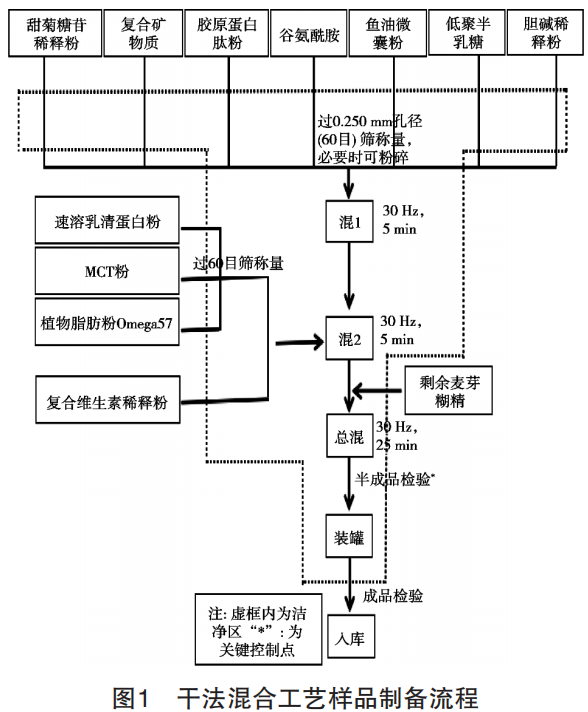 粉狀特醫(yī)食品的工藝主要有干法、濕法、干-濕復(fù)合法[10]。濕法工藝的特點(diǎn)是能耗大,產(chǎn)品均勻性相對較好,生產(chǎn)期間對熱敏性營養(yǎng)素造成一定程度損失;干法工藝的特點(diǎn)是能耗低、工藝設(shè)備簡單,不會造成營養(yǎng)素?fù)p失。國外多采用干法工藝,但其缺點(diǎn)就是某些微量元素不易在產(chǎn)品中混勻,影響產(chǎn)品的質(zhì)量?;谇捌谝褜Ω煞ā穹案?濕復(fù)合工藝中營養(yǎng)素的均勻性進(jìn)行了研究,表明干法工藝也可以達(dá)到混合性的要求[11-12]。
