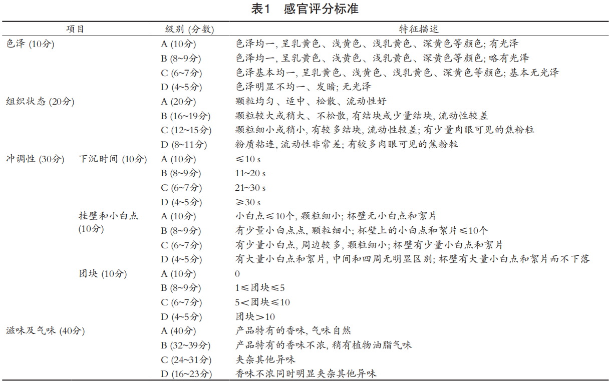 以粉狀全營養(yǎng)配方食品的色澤與組織狀態(tài)、滋味 與氣味、沖調(diào)性為指標(biāo),進(jìn)行感官評價。評定參考RHB 204—2004《嬰兒配方乳粉感官評鑒細(xì)則》[13], 詳見表1。