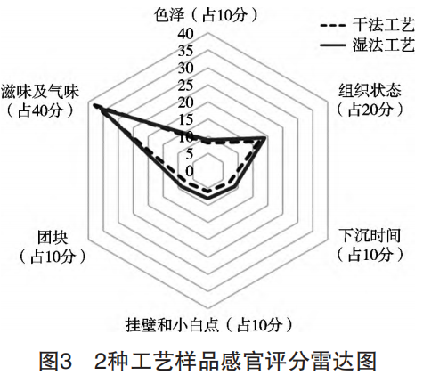 根據(jù)評分結(jié)果繪制感官雷達(dá)圖,見圖3。濕法工藝樣品的感官總體優(yōu)于干法工藝,噴霧干燥產(chǎn)品的溶解性、顆粒度和沖調(diào)性較好[18],除滋味及氣味外,濕法工藝制備的樣品其色澤、組織狀態(tài)、沖調(diào)性均優(yōu)于干法工藝樣品。