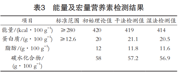 按照GB 29922—2013《特殊醫(yī)學(xué)用途配方食品通 則》進(jìn)行能量檢測;按照GB 5009.5—2016《食品中蛋 白質(zhì)的測定》進(jìn)行蛋白質(zhì)含量檢測;按照GB 5009.6— 2016《中脂肪的測定》進(jìn)行脂肪含量檢測;按照GB 28050—2011《預(yù)包裝食品營養(yǎng)標(biāo)簽通則》問答(減 法)進(jìn)行碳水化合物檢測。