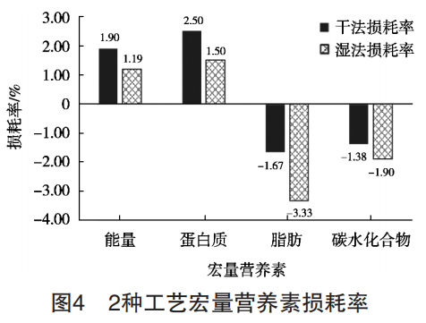 2種工藝制備的樣品宏量營養(yǎng)素及能量的測定值 見表3,損耗率見圖4。
