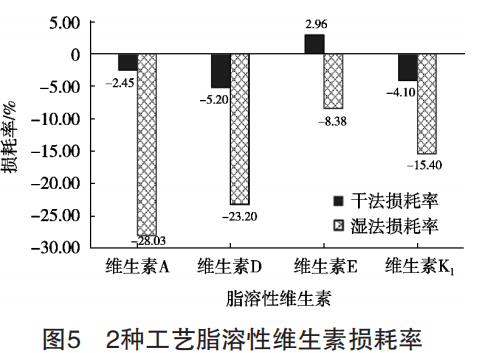 2種工藝制備的樣品脂溶性維生素?fù)p耗率見圖5。干法工藝脂溶性維生素的損耗率均在10%以內(nèi),在檢 測精密度范圍之內(nèi),可認(rèn)為未引起明顯損耗。而濕法 工藝的脂溶性維生素?fù)p耗率明顯大于干法工藝,其中 維生素A的損耗率最大,為28.03%,其次為維生素D (23.20%)、維生素K1(15.40%),而維生素E未引 起明顯損耗,與孫健等[23]的研究結(jié)果一致。