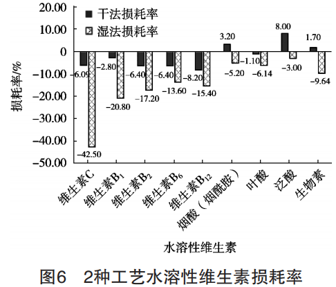 2種工藝制備的樣品水溶性維生素?fù)p耗率見圖6。