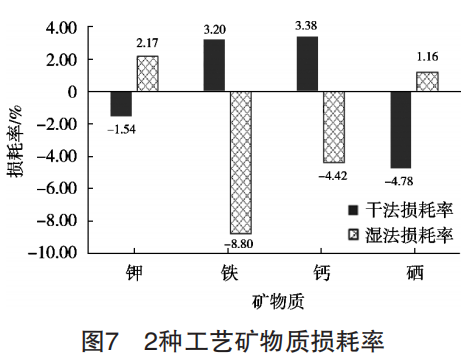 2種工藝制備的樣品礦物質(zhì)損耗率見圖7。2種工 藝制備的樣品礦物質(zhì)營養(yǎng)素?fù)p耗率均在10%以內(nèi),其 中以濕法工藝中鐵的損耗率最大,為8.80%,但在檢 測精密度范圍之內(nèi),可認(rèn)為未引起明顯損耗。礦物質(zhì) 本身性質(zhì)較為穩(wěn)定,對空氣、溫度、光照等外界因素 的耐受性比維生素強(qiáng),損耗率相對維生素也低[24]。