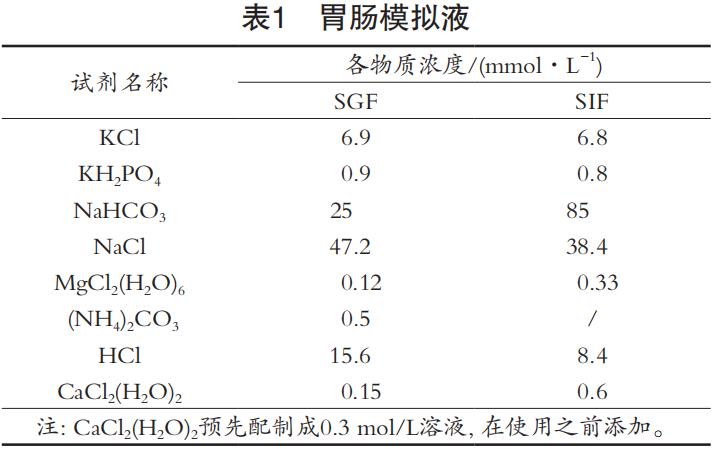 胃模擬液(simulated gastric juice,SGF)和腸模 擬液(simulation intestinal fluid,SIF)的濃度見(jiàn)表1。試驗(yàn)前,可先配制胃腸模擬液備用。