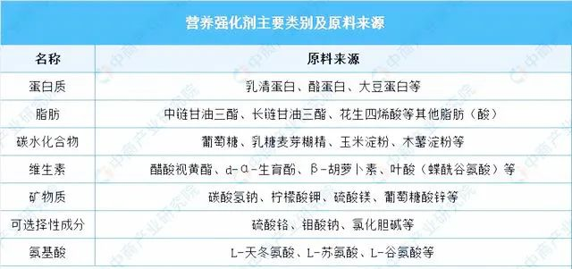 營(yíng)養(yǎng)強(qiáng)化劑是指為了增加食品的營(yíng)養(yǎng)價(jià)值而加入食品中的天然或人工合成的營(yíng)養(yǎng)素和其他營(yíng)養(yǎng)成分。營(yíng)養(yǎng)素是具有特定生理作用,能維持機(jī)體生長(zhǎng)、發(fā)育、活動(dòng)、繁殖及正常代謝所需的物質(zhì),包括蛋白質(zhì)、脂肪、碳水化合物、礦物質(zhì)、維生素等。目前,我國(guó)特醫(yī)食品中可添加的營(yíng)養(yǎng)素及相關(guān)原料來源如下圖所示: