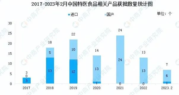 近年來,我國(guó)對(duì)特醫(yī)食品的重視程度越來越高,藥企、乳企等紛紛加入特醫(yī)食品的研發(fā)生產(chǎn)中,成為特醫(yī)食品行業(yè)創(chuàng)新與高質(zhì)量發(fā)展的動(dòng)力。從特醫(yī)食品企業(yè)相關(guān)產(chǎn)品獲批情況來看,截至2023年2月底我國(guó)共有101個(gè)特醫(yī)食品產(chǎn)品獲得批準(zhǔn)。其中,國(guó)產(chǎn)產(chǎn)品71個(gè),進(jìn)口產(chǎn)品30個(gè),分別占比70.3%和29.7%。