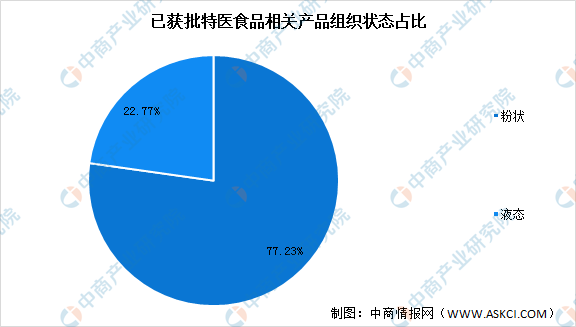 從產(chǎn)品組織狀態(tài)來看,目前獲批的101款特醫(yī)食品產(chǎn)品中粉狀產(chǎn)品有78款,占比77.23%;液態(tài)產(chǎn)品有23款,占比22.77%。
