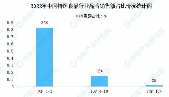跟據(jù)《2022年?duì)I養(yǎng)健康趨勢(shì)白皮書》數(shù)據(jù),截至2022年線上在售的特醫(yī)食品共計(jì)40款,京東健康已上線39款。品類特性導(dǎo)致該類產(chǎn)品的市場(chǎng)集中度高,TOP3品牌銷售額占比達(dá)83%。長(zhǎng)期看,隨著健康意識(shí)的普及和政策的逐漸完善,日后將會(huì)有更多品牌涌入市場(chǎng),特醫(yī)產(chǎn)品的品類也會(huì)變得更加豐富。
