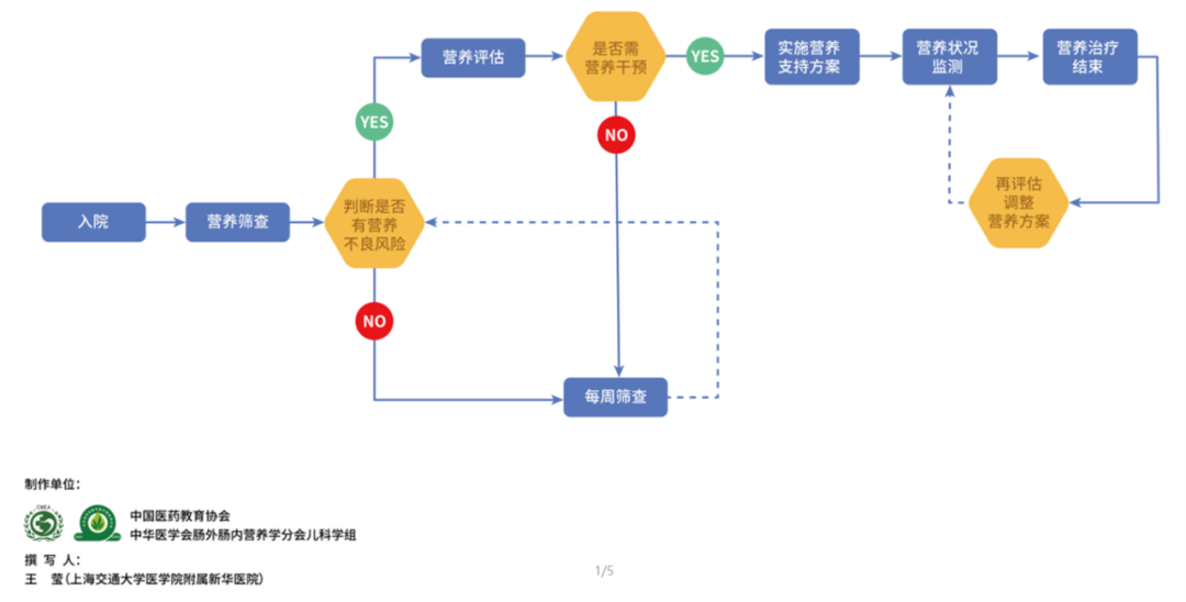 雖然近年來營養(yǎng)干預(yù)在臨床診療中的參與感日益增強,但并非所有住院患兒都能獲得規(guī)范化、及時有效的基于循證醫(yī)學的營養(yǎng)干預(yù),EN支持不足、錯過最佳干預(yù)時機、醫(yī)護意識欠缺等情況仍普遍存在,進一步規(guī)范臨床營養(yǎng)管理流程應(yīng)是未來臨床診療中深耕的方向。中華醫(yī)學會腸外腸內(nèi)營養(yǎng)學分會兒科學組制作了一系列住院患兒標準化營養(yǎng)管理流程工具,或有助于幫助大家在診療中更好的提供營養(yǎng)管理。