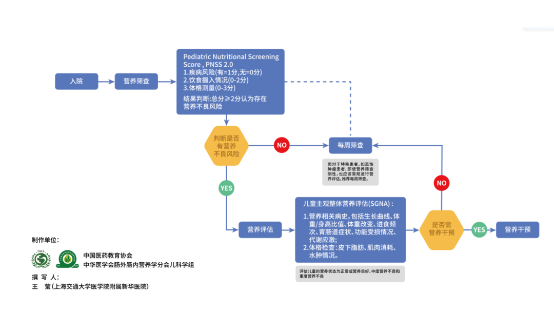 為支持、推進臨床營養(yǎng)標準化,使得患兒獲得及時、合理、安全的臨床營養(yǎng)支持,中華醫(yī)學會腸外腸內(nèi)營養(yǎng)學分會兒科學組制作了一系列住院患兒標準化營養(yǎng)管理流程工具,以幫助醫(yī)護人員在臨床工作中更好地提供規(guī)范、合理及科學的臨床營養(yǎng)支持。住院患兒標準化營養(yǎng)管理總流程:營養(yǎng)篩查-營養(yǎng)評估-營養(yǎng)干預(yù),是營養(yǎng)診療的3個關(guān)鍵步驟